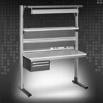 Благодаря свободному перемещению столешницы, полки и освещения по направляющим обеспечивается возможность установки рабочих поверхностей на требуемой высоте и непревзойденный комфорт при работе, в том числе и в положении стоя. При возникновении необходимости изменить высоту рабочей поверхности, пользователь может легко самостоятельно переместить столешницу, полку и освещение.